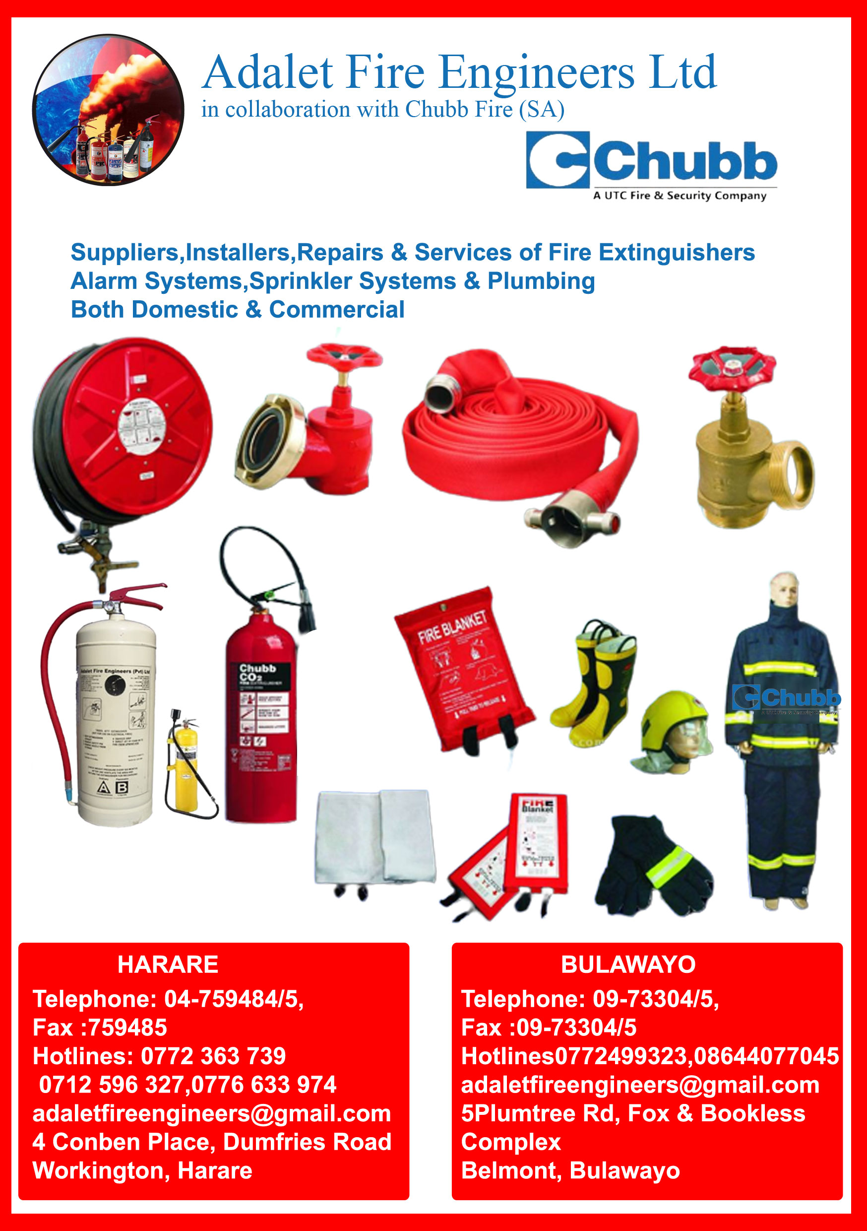 ADALET FIRE ENGINEERS (PVT) LTD was established in Zimbabwe in 2002. The company is a valid affiliate of both the Fire Protection Association of Zimbabwe and the Fire Prevention Inspection Bureau. The company is also duly accredited by the Harare Fire Brigade to carry out fire-fighting activities.